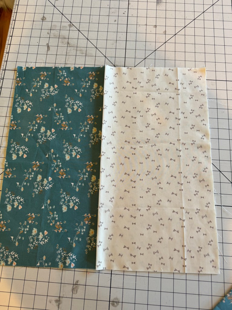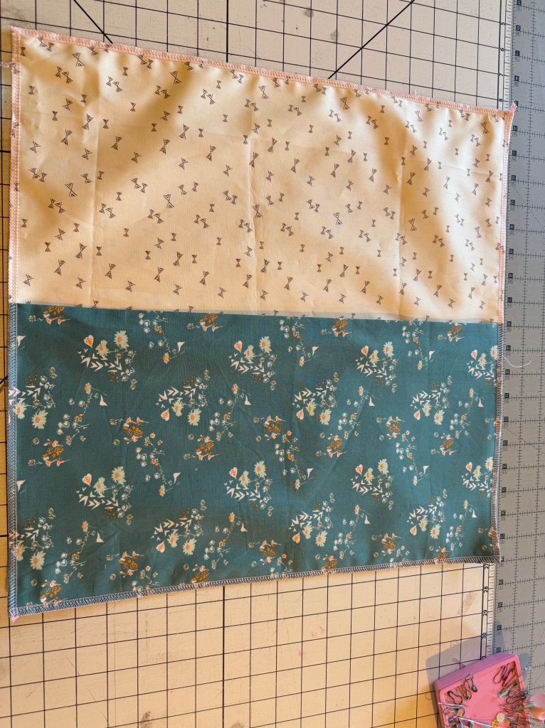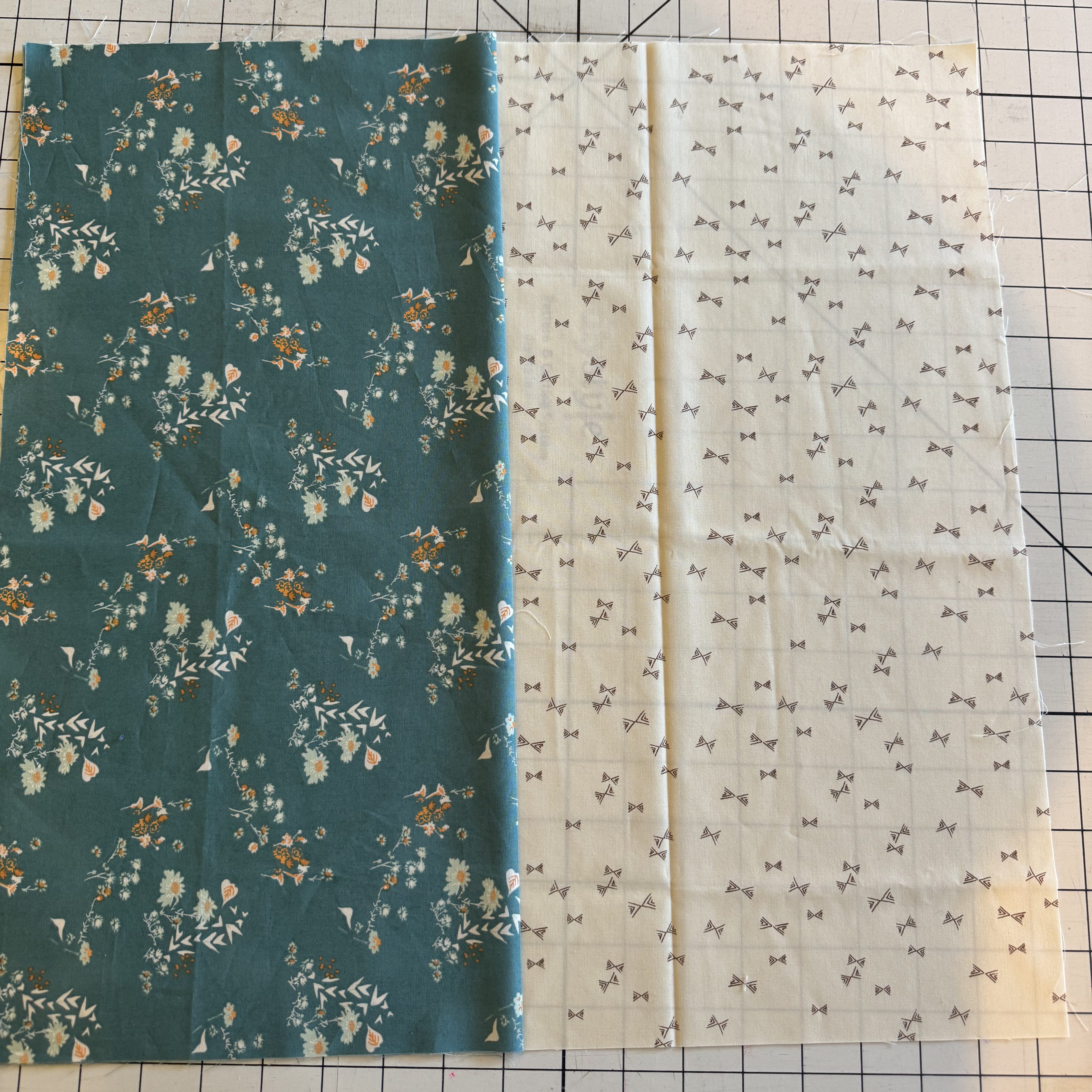 3. Layer the folded and fused Piece (C) on top of Piece (A), matching Piece (C)‘s raw edges to the bottom of Piece (A). Ensure folded edge is in the center. Right sides will be together because it is folded in half.